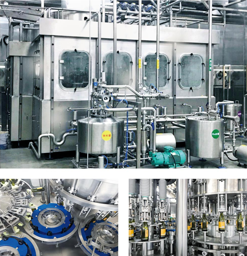 卸瓶機、洗瓶機、洗-灌-封主機、凈化、上蓋、理蓋、溫瓶/噴淋、實瓶輸送、貼標機、裝箱/裹包、碼垛、電氣控制、工程設計和施工等。